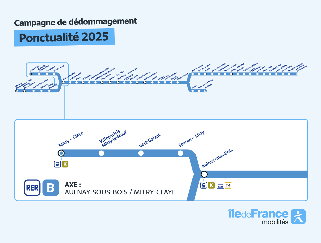 L’axe Aulnay-sous-Bois / Mitry-Claye du RER B, opéré par Transilien SNCF Voyageurs pour le compte d'Île-de-France Mobilités, a enregistré une ponctualité inférieure à 80% pendant 5 mois en 2025, ouvrant droit à un remboursement.