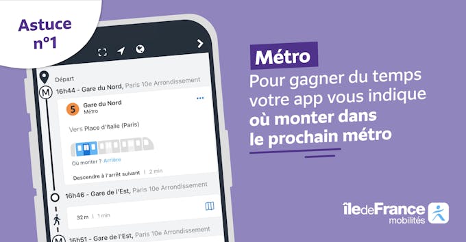 Do you like to save time? Middle, front, rear: the Île-de-France Mobilités app simply tells you, with a small pictogram, the car to get into to get closer to your exit or connection.