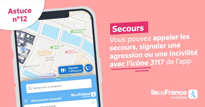 Are you a witness or a victim in transport? Open the Île-de-France Mobilités app and click on the 3117 icon on the home screen to alert or call for help.
