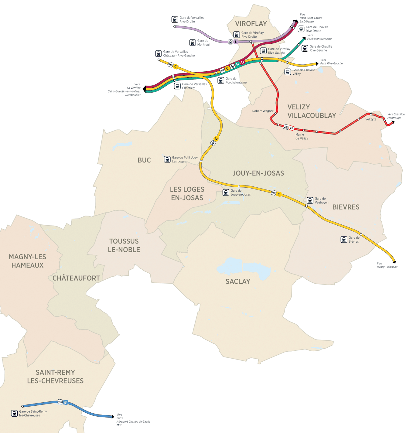- from the east and south-east of the Versailles Grand Parc agglomeration community: Bièvres, Buc, Châteaufort, Jouy-en-Josas, les Loges-en-Josas, Toussus-le-Noble, Vélizy-Villacoublay and Viroflay