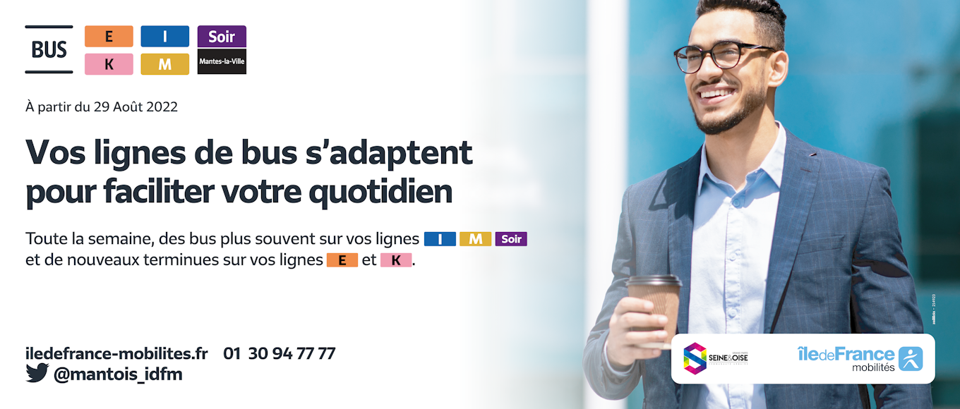 From 29 August 2022, your Evening Buses will take over from your usual lines (bus lines E, I, K and M) from Mantes-la-Ville Bus Station!