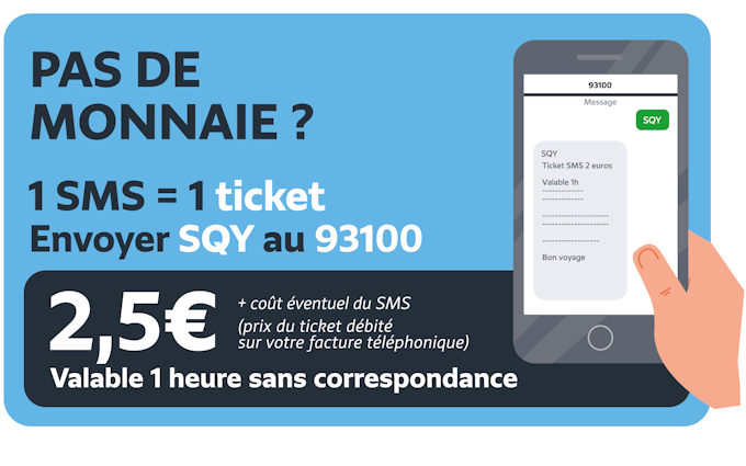 The SMS Boarding Ticket is sold exclusively individually. All you have to do is text "SQY" to 93 100 and you will receive a ticket in the form of an SMS! You will be charged to your mobile bill.