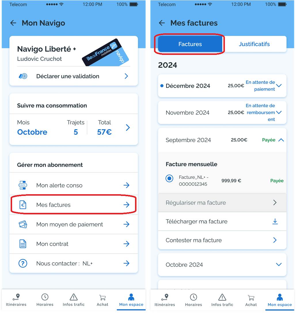 The monthly Navigo Liberté + bill is available to you each month (no earlier than the 11th of the month following the trips) in yourpersonal space, in the Île-de-France Mobilités mobile application, in the "My bills" section, under the "Invoice" tab.