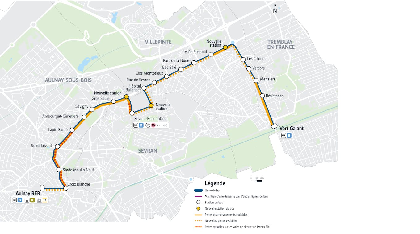The project consists of creating dedicated bus lanes and specific developments to improve the flow of bus traffic (priority at intersections in sectors shared with private vehicles, for example) between Aulnay-sous-Bois and Tremblay-en-France. The route largely follows the route of the current line 15, between the RER stations of Aulnay-sous-Bois and Vert Galant, passing through the RER station of Sevran-Beaudottes, serving four municipalities (Aulnay-sous-Bois, Sevran, Villepinte, Tremblay-en-France).