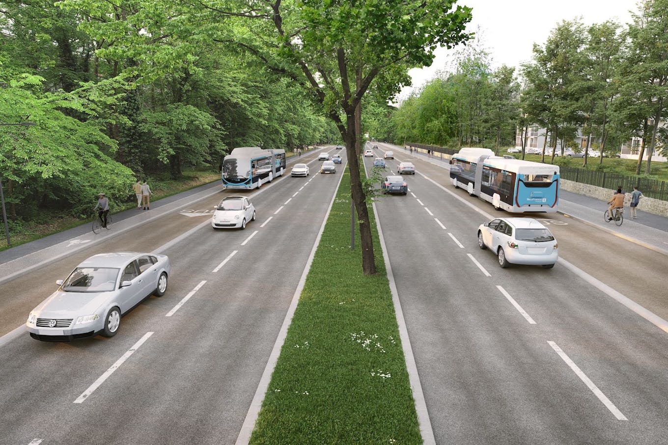 This option would make it possible to improve the flow of bus traffic thanks to the dedicated lanes in both directions and to make the existing cycle paths safer, while reducing the number of trees to be cut down (less than 20).