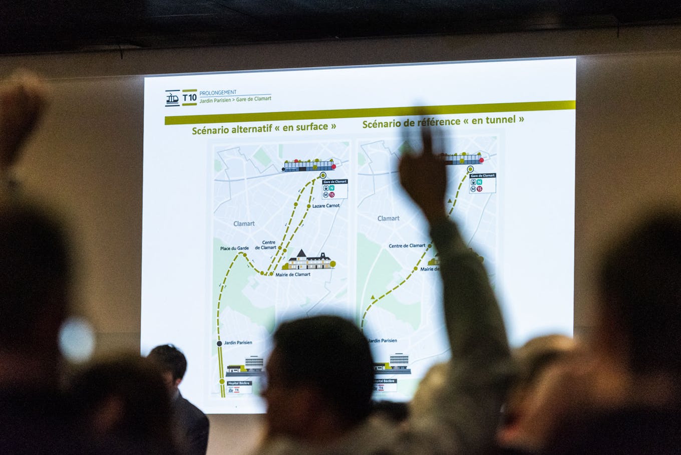 Organised on 7 March 2023 from 7 pm to 9.30 pm at the Hunebelle room in Clamart, the public meeting to open the preliminary consultation was intended to present the framework and modalities of the consultation, the T10 tram extension project and the two scenarios submitted for consultation. It was also a question of allowing a first time of exchanges with the public.