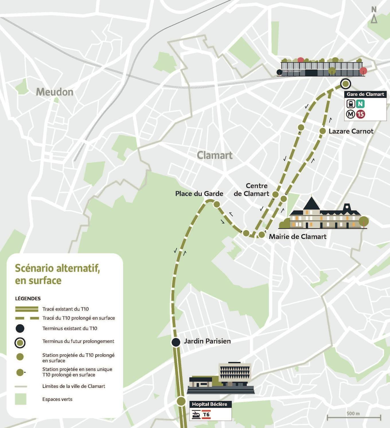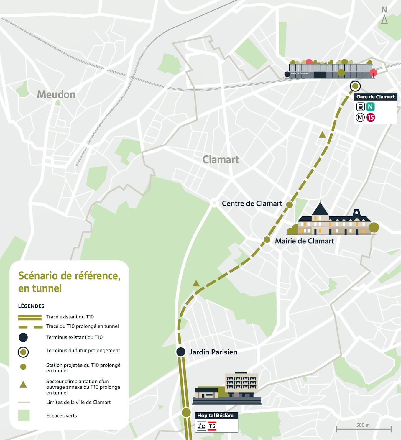 To connect the Jardin Parisien station to the Clamart station, in connection with the future metro line 15 and the N train, two scenarios were considered. A classic surface scenario was initially studied, but it was quickly confronted with a dense urban environment and the significant natural and architectural heritage specific to this territory. To overcome these constraints, a tunnel scenario has been studied. Although more technically complex, it would reduce the impacts identified for the surface scenario.