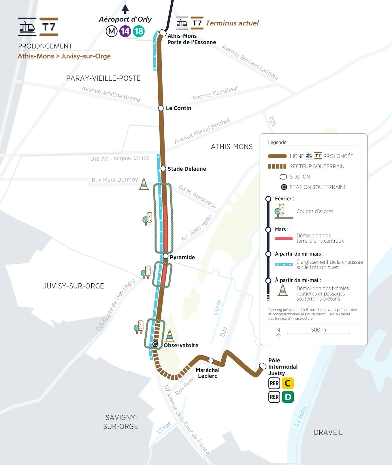 The extension of the T7 tram line will be carried out in several stages. The in-depth studies carried out in recent years now make it possible to start the work, starting with the concession and preparatory works on the RN7 sector. From February 2023, this essential step will take place in successive sections. To find information on works in your municipality, consult the pages dedicated to the cities of Athis-Mons, Paray-Vieille-Poste and Juvisy-sur-Orge.