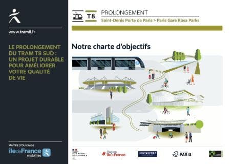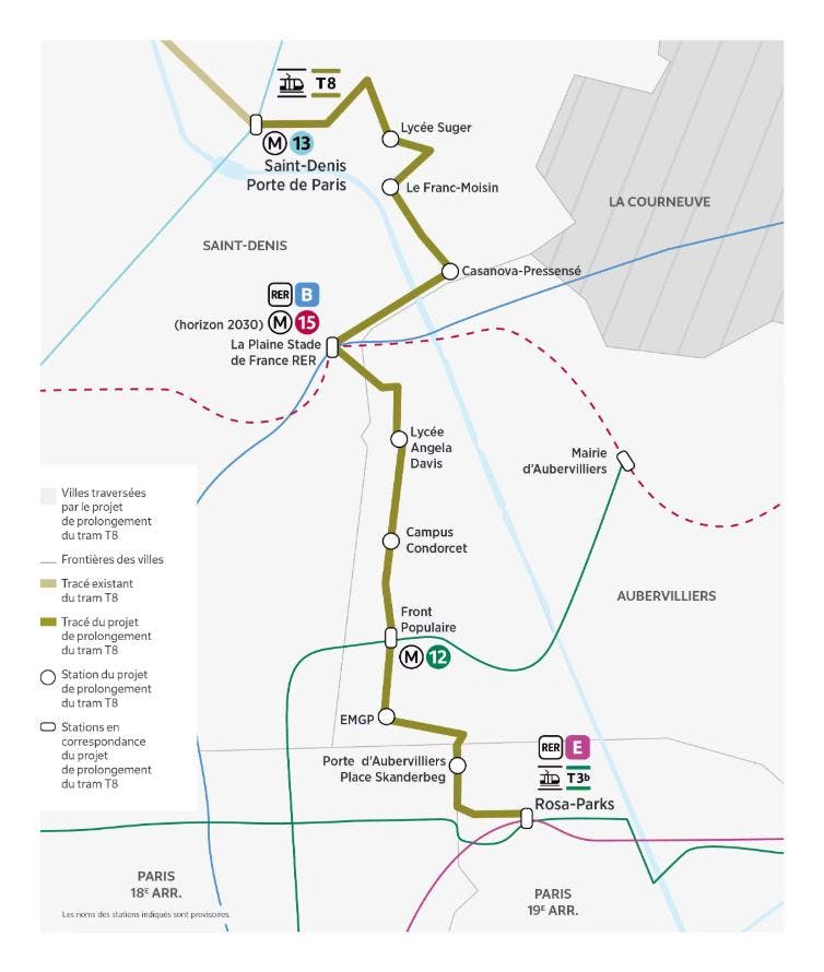 The T8 tram extension project, led by Île-de-France Mobilités (IDFM), extends the existing tramway to the south, creating 10 new stations over 5.5 km between the current Saint-Denis – Porte de Paris terminus and the Paris – Rosa Parks RER station. It must cross the communes of Saint-Denis, Aubervilliers and the 18th and 19th arrondissements of Paris.