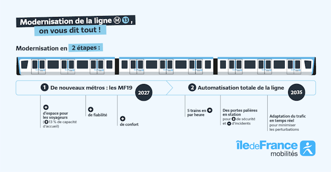 Convencida de la importancia de mejorar el confort de esta línea, una de las más transitadas de la red, y anticipando el aumento del número de pasajeros que debería acompañar a los proyectos de desarrollo y creación de empleo en la periferia de París, Île-de-France Mobilités ha optado por invertir en su modernización. Una modernización que pasa por la automatización de la línea 13.