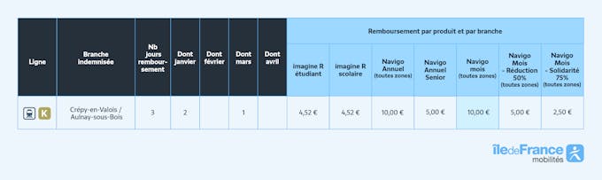 Infografía que representa el ramal de la línea K afectado por la campaña de reembolso entre Crépy-en-Valois y Aulnay-sous-Bois.