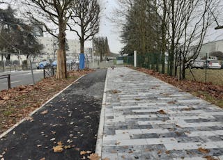 La colocación del pavimento alrededor de la estación de Villa Nova en Villeneuve-Saint-Georges revela los contornos de la gran explanada que precederá a la entrada de la estación. Las lamas de piedra caliza gris recuerdan la gama cromática de las fachadas de la sala técnica. El carril bici de un solo sentido ya es visible. Los soportes sobre los que se colocará la marquesina de la estación están en su lugar. También se delimitan los andenes de las paradas de autobús, los lugares de bajada, así como los dedicados al personal operativo.