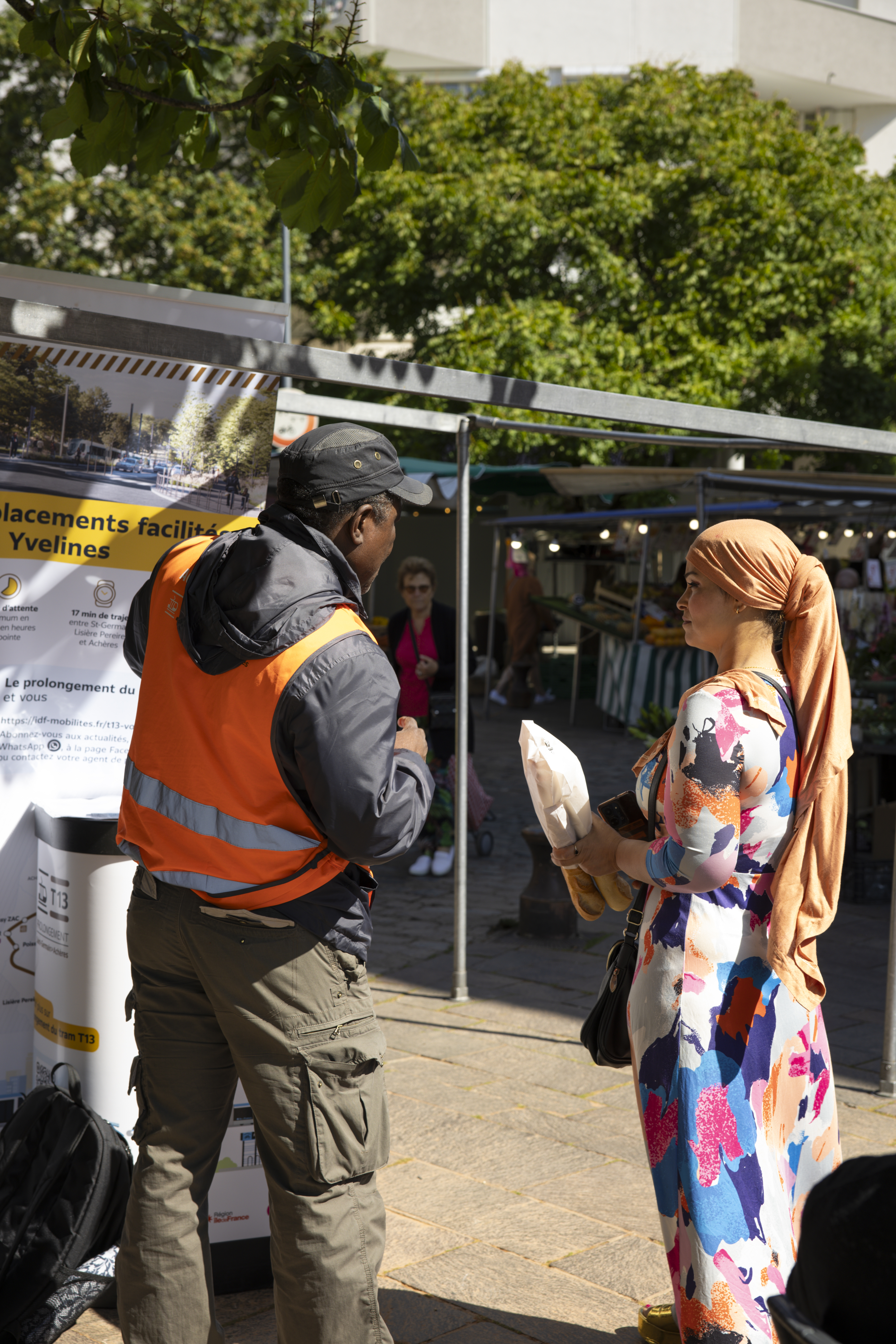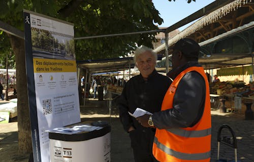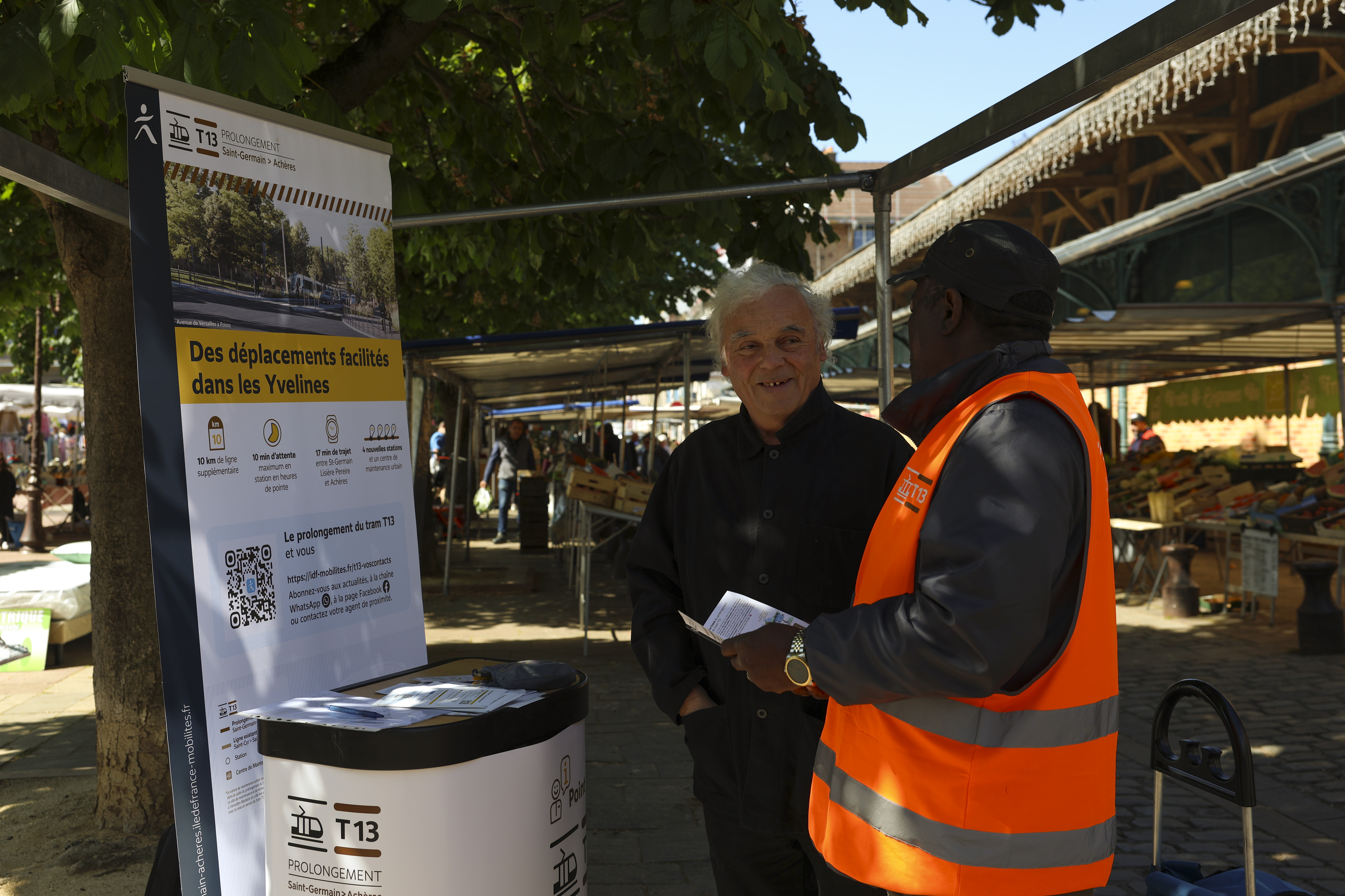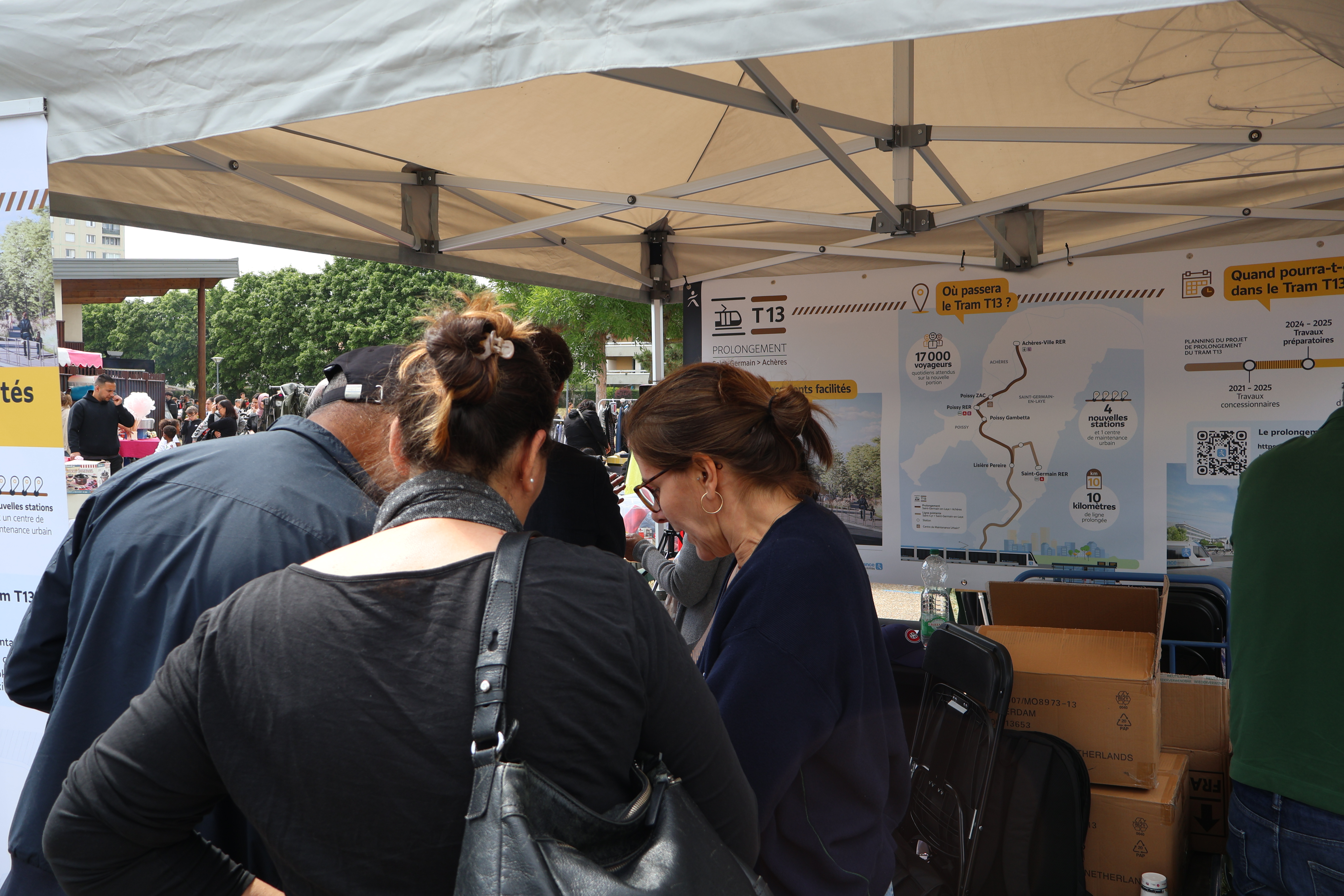 El sábado, Romain y el equipo tuvieron un puesto de "Extensión del tranvía T13" en el mercado de pulgas del barrio de Saint-Exupéry. Este día agradable y soleado estuvo marcado por muchos intercambios con los habitantes. Varios representantes de Île-de-France Mobilités y SNCF Réseau estuvieron presentes en el lugar para dar respuestas precisas a los visitantes, incluso sobre los aspectos más técnicos del proyecto.