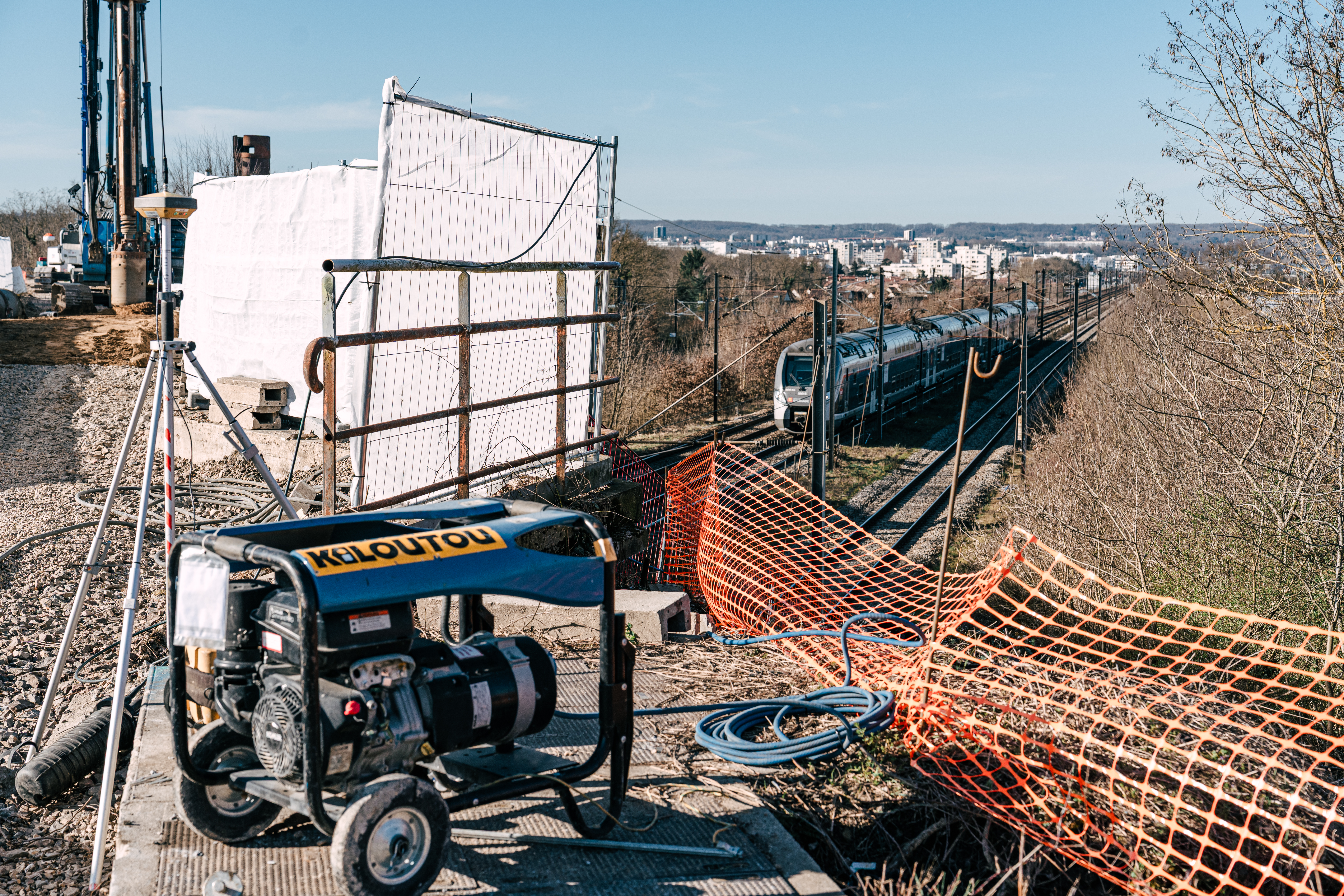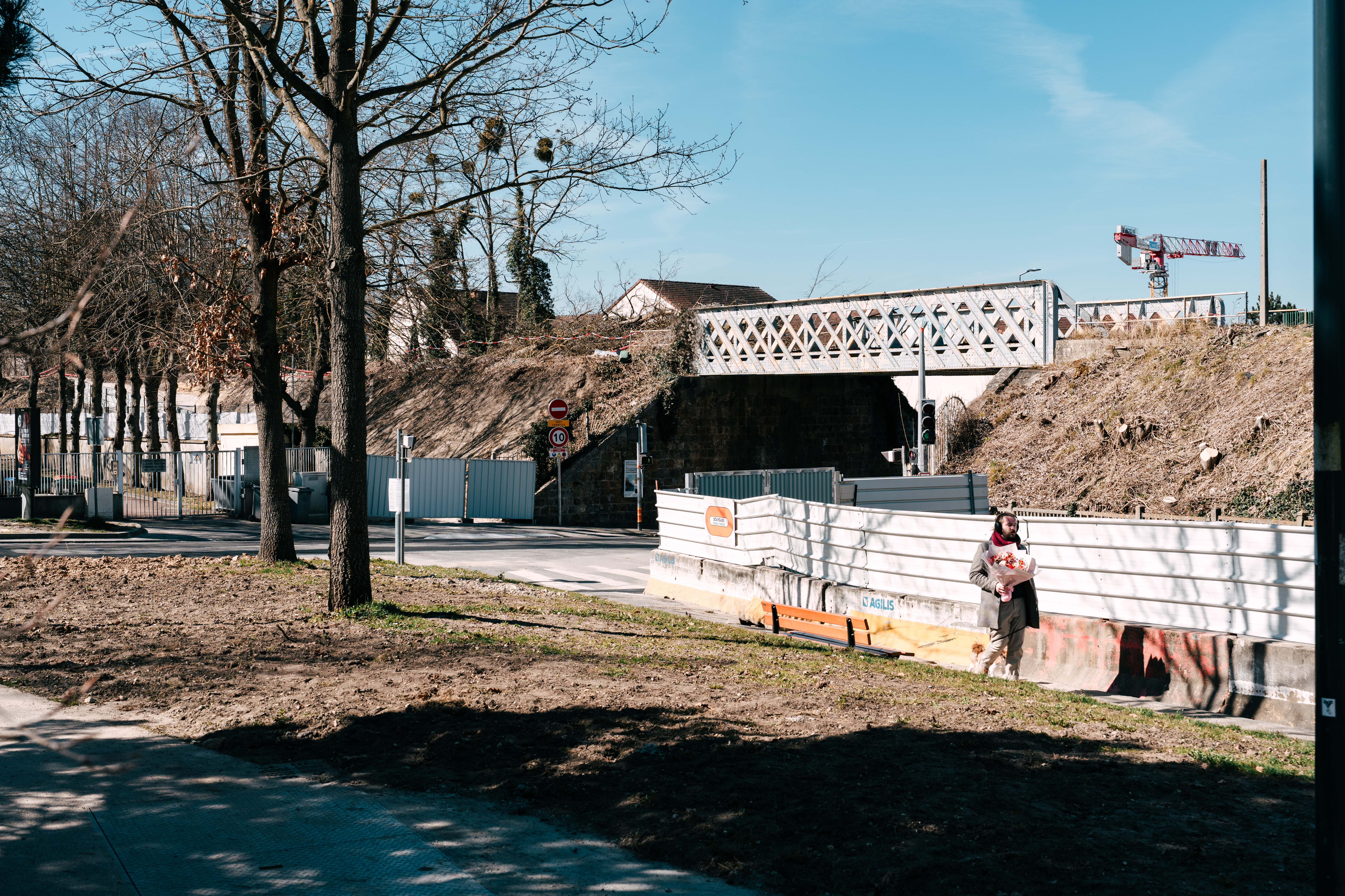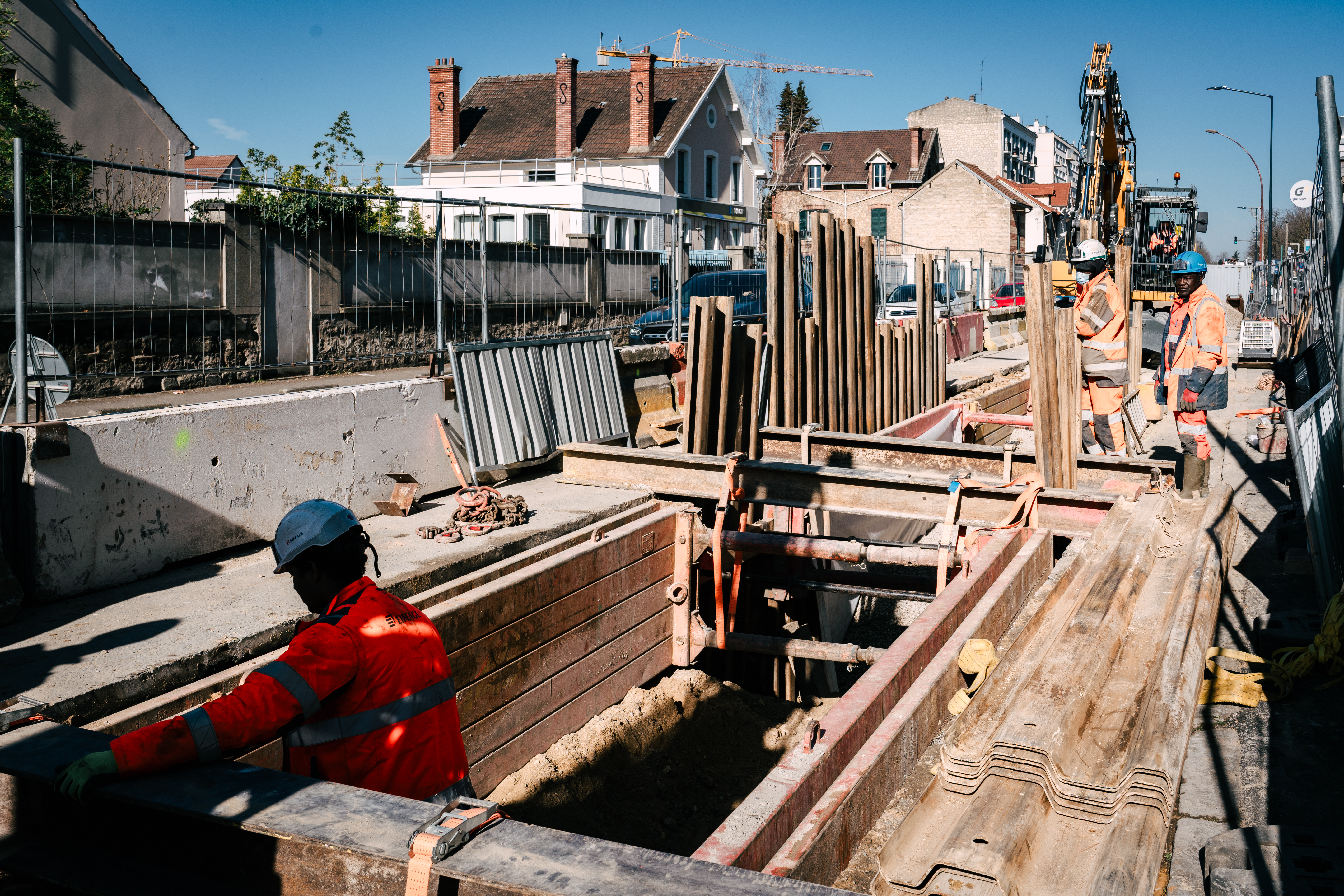 - Al final de la rue Saint-Sébastien, muy cerca de la rue Adrienne Bolland, se ha instalado un campamento base para orquestar el trabajo en esta zona. Actualmente se está construyendo un muro a lo largo del Clos Saint-Exupéry para soportar las vías férreas por donde discurre el RER A.
