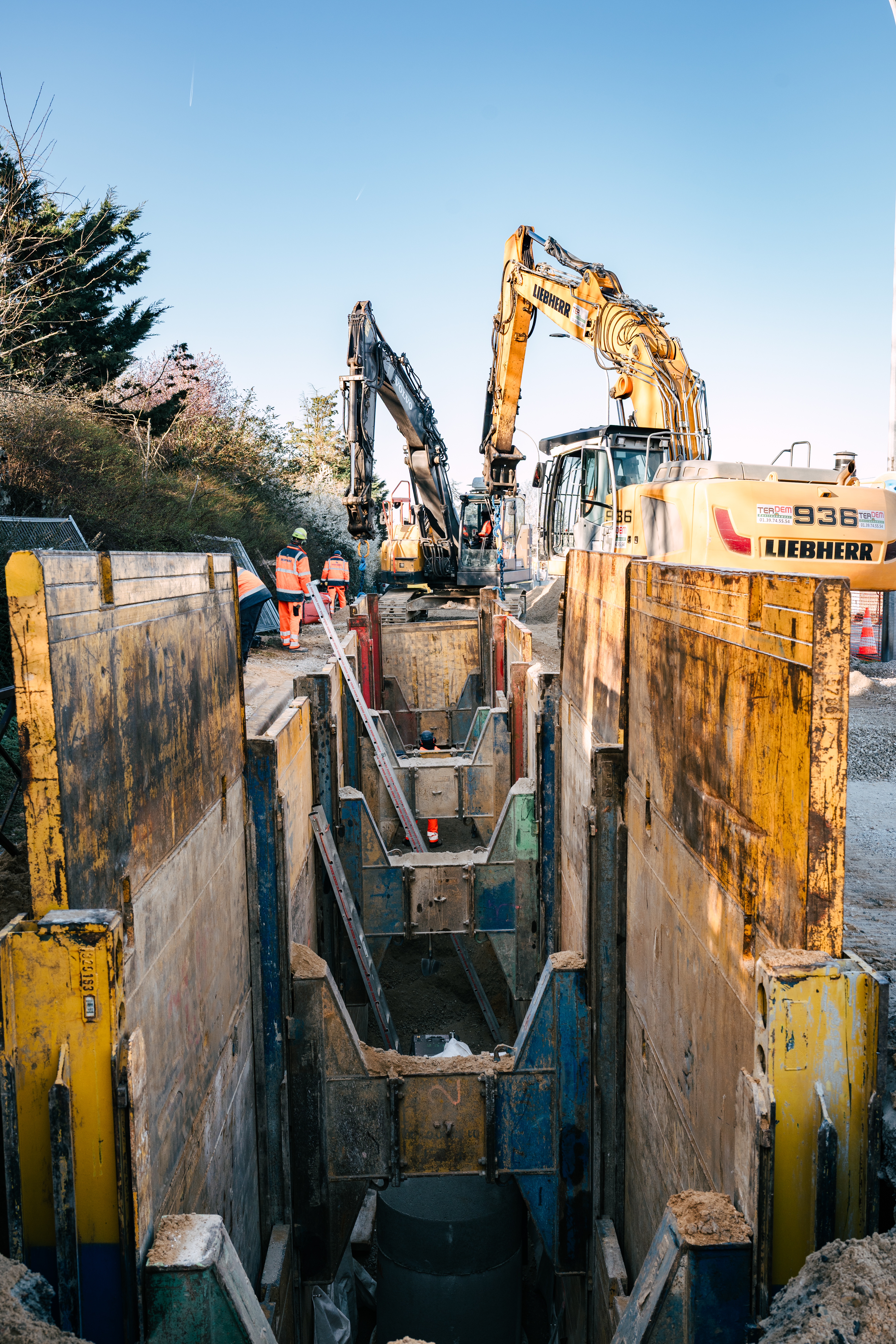 Continúan los trabajos a lo largo de todo el recorrido para finalizar la construcción de la prolongación del Tranvía T13. Continúan las obras de concesión para desviar las redes existentes de agua, electricidad, gas e internet situadas bajo la futura plataforma tranviaria, especialmente en el centro de la ciudad de Poissy y en el barrio de Saint-Exupéry.