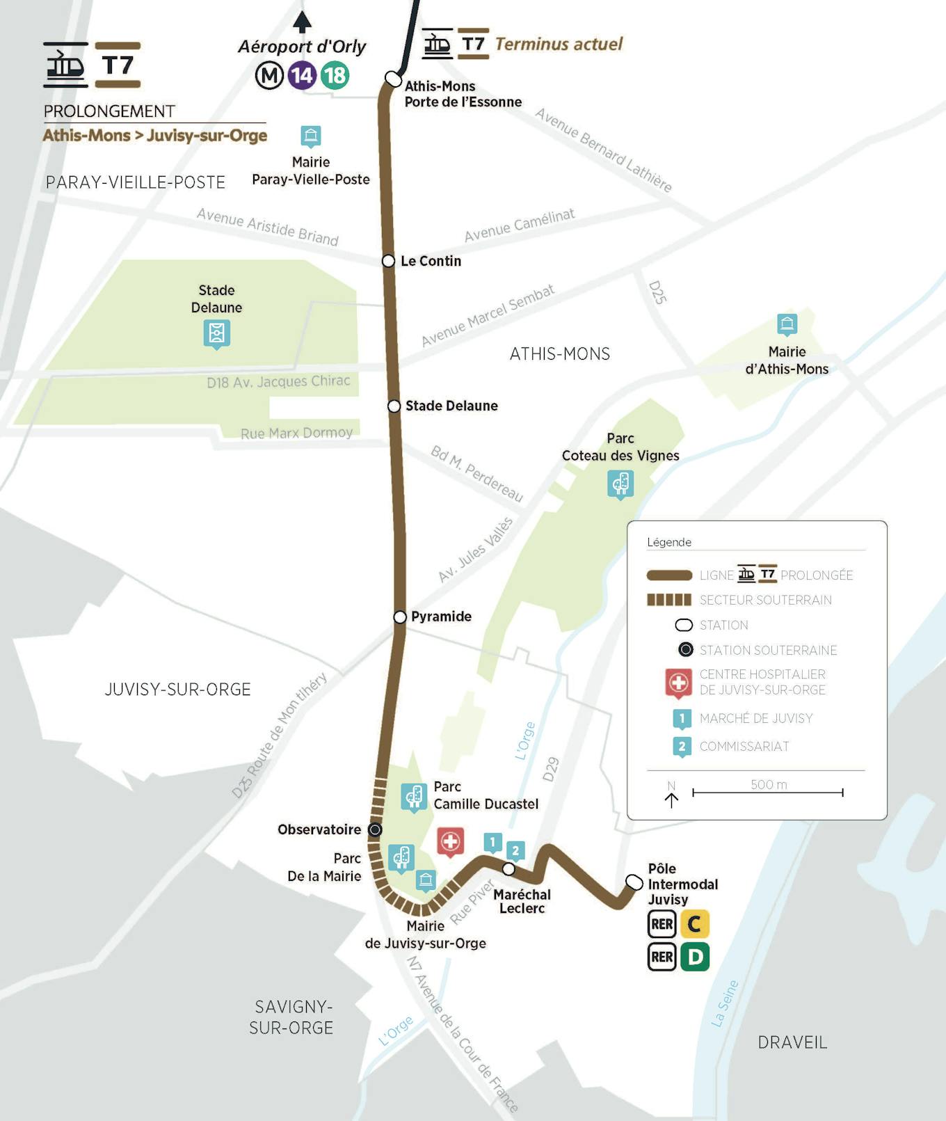La ampliación del tranvía T7 dará servicio a Athis-Mons, Paray-Vieille-Poste y Juvisy-sur-Orge gracias a la creación de 6 nuevas estaciones, incluida una estación subterránea.
