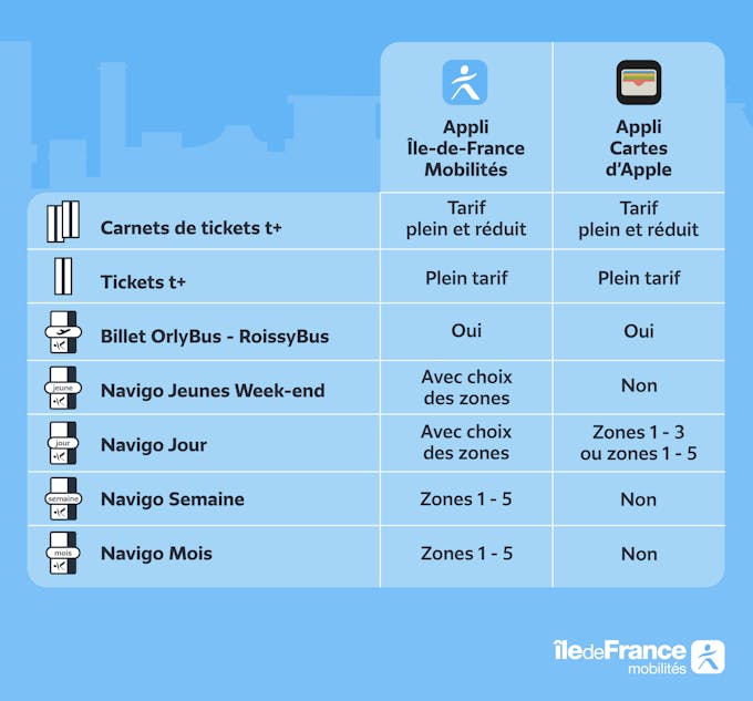 *Per caricare i titoli su un iPhone o un orologio, l'utente deve disporre almeno di un iPhone XS o XR o iPhone SE 2 con almeno iOS 17.5 e versione 8.1 dell'app Île-de-France Mobilités e di un modello Watch Series 6 o Watch SE 2 con almeno la versione WatchOS 10.5.