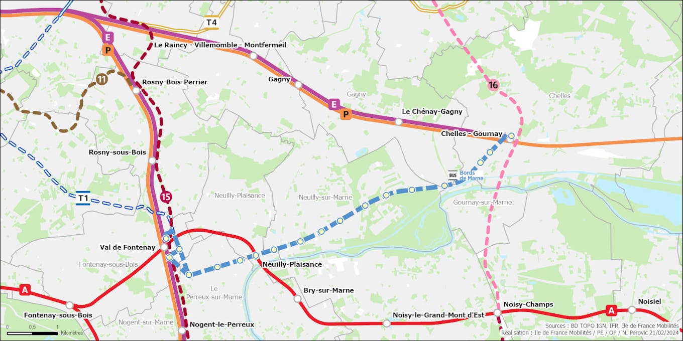 Carte de l'évolution du réseau du transport collectif à l'horizon de mise en service du projet avec notamment les RER A, RER E, Ligne P, nouvelles lignes de métro 15 et 16, prolongement du T1 à Val de Fontenay.