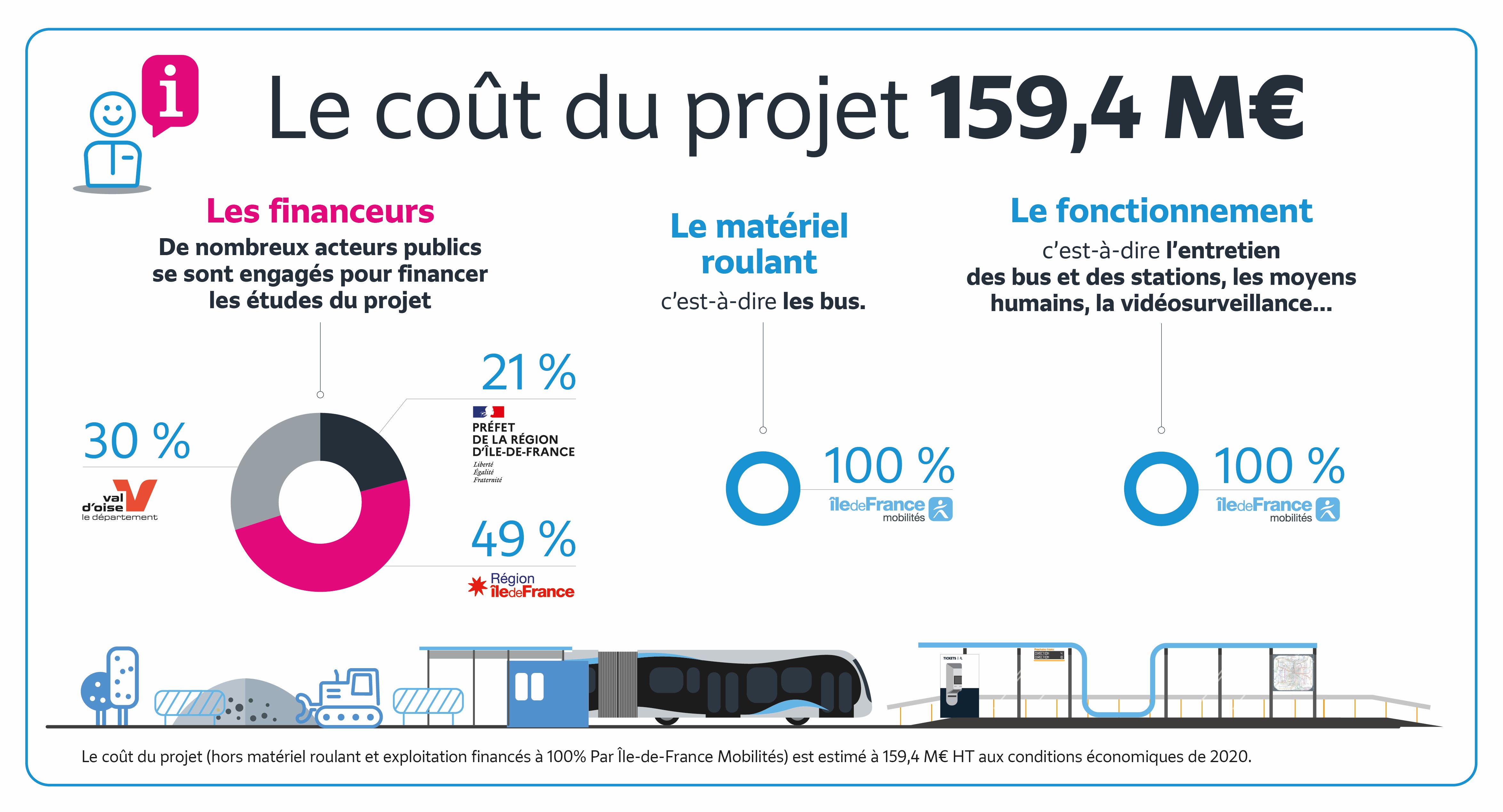 L’exploitation (c’est-à-dire l’entretien des bus et des stations, les moyens humains et la vidéosurveillance, etc.) sera financée à 100% par Île-de-France Mobilités.