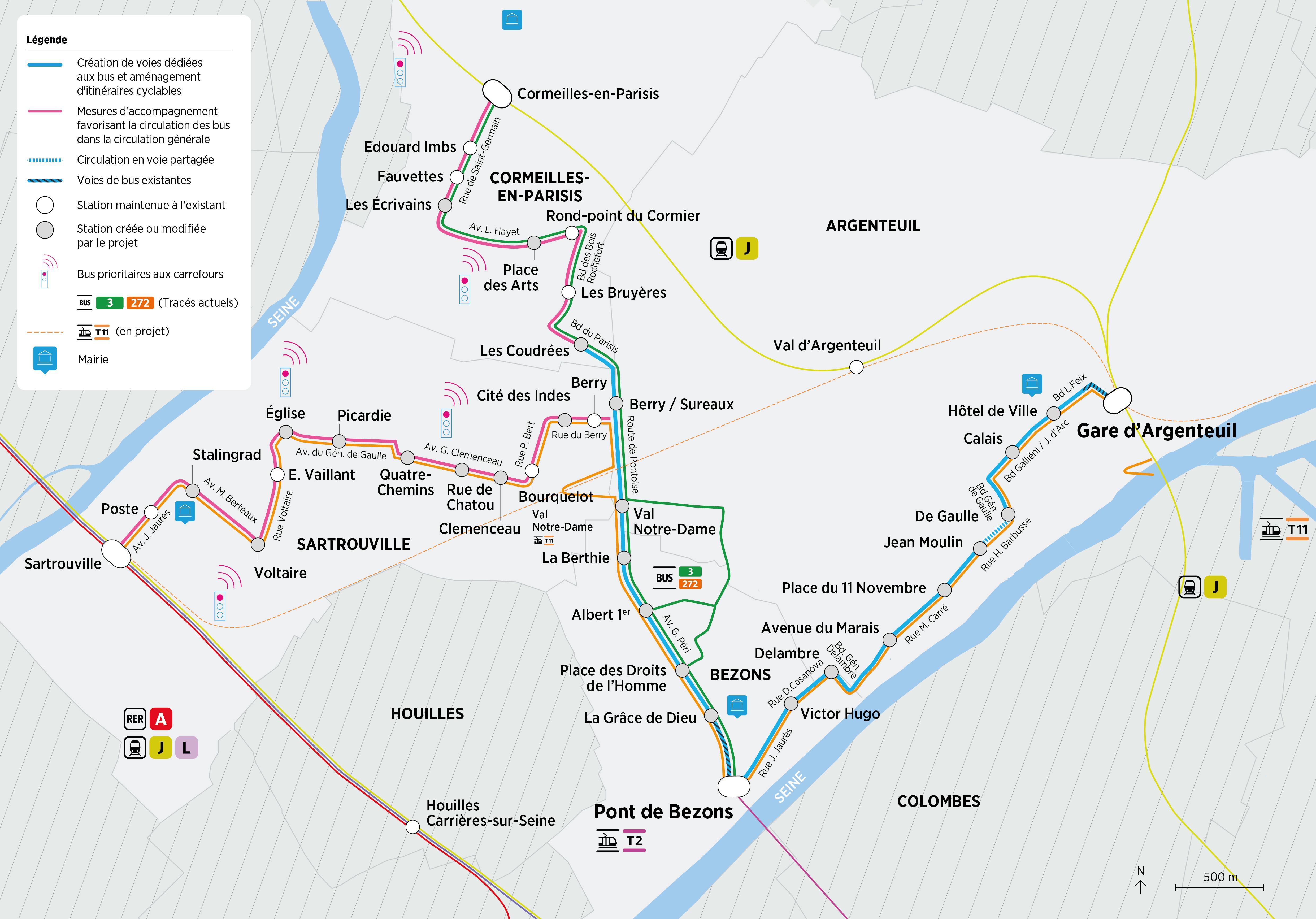 Le projet réutilise le couloir bus de l’avenue Maurice Berteaux et élargit les couloirs ouverts aux cycles sur le boulevard Léon Feix. Il accompagne également l’ambition de la Ville d’Argenteuil dans le cadre du projet « La Canopée – Gabriel Péri », pour redonner vie aux espaces publics autour de l’Hôtel de Ville.