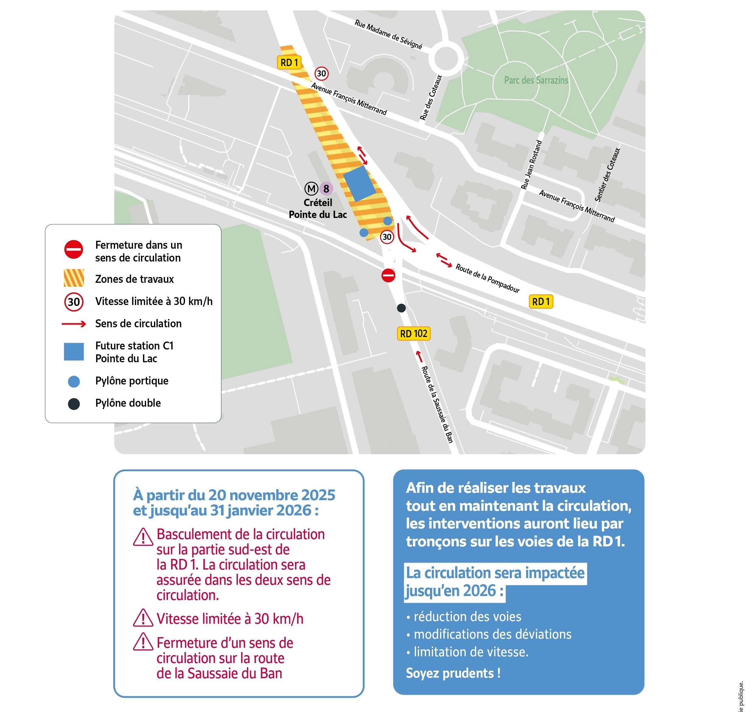 Dans le cadre de la réalisation de la future station Pointe du Lac et de la passerelle reliant la station du métro 8 au mail François Mitterrand, des travaux de voirie sont prévus sur la RD 1.
