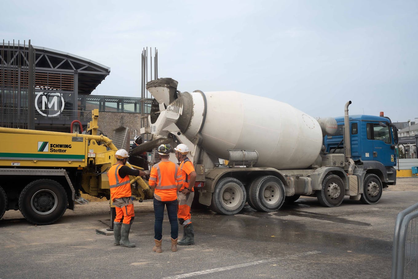 Lorsque les camions-toupies arrivent sur le chantier pour l’approvisionner en béton, le compagnon désigné effectue un prélèvement de béton afin de vérifier la conformité de la livraison par rapport à la commande.