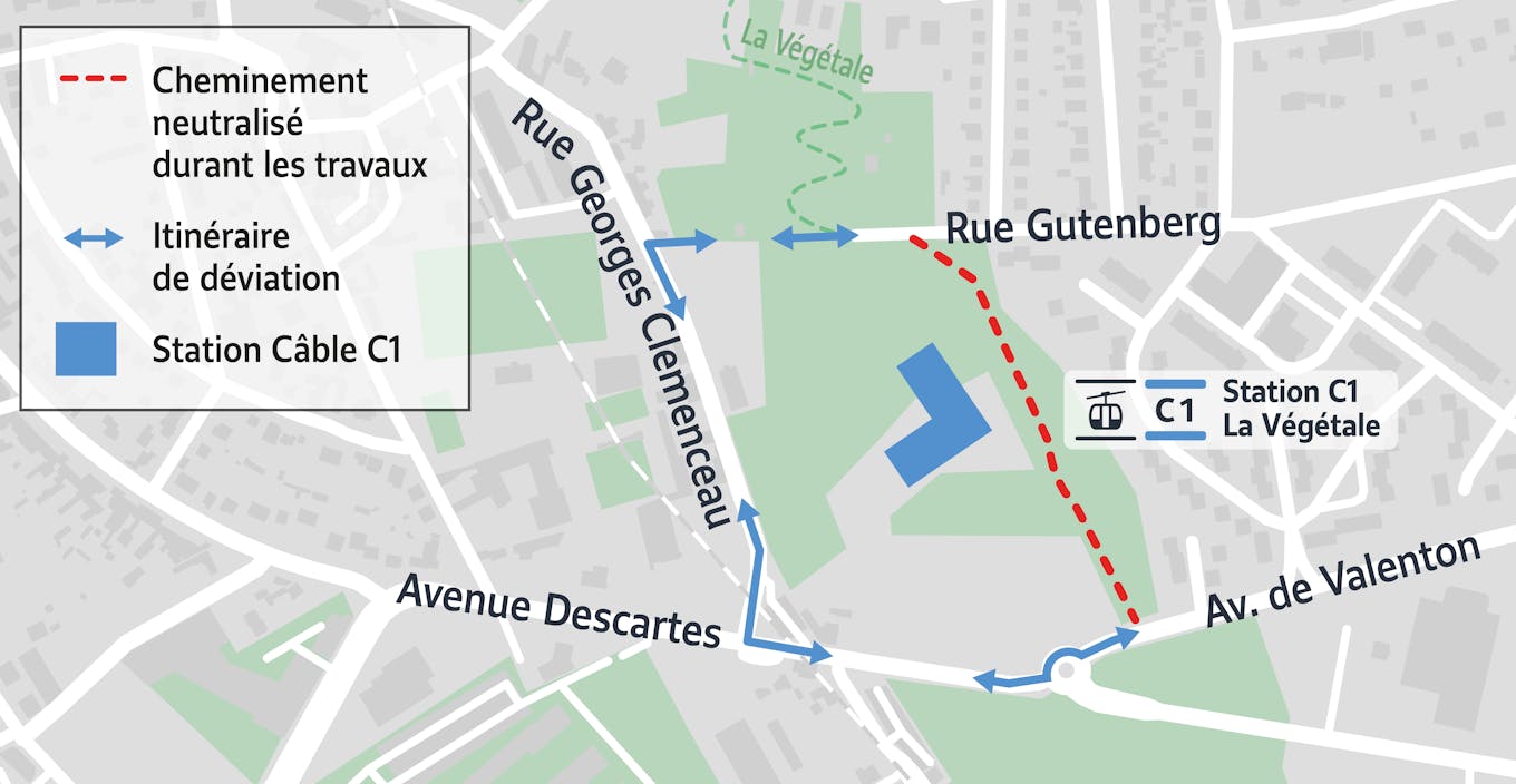 Dans le cadre des travaux d'aménagement des abords de la station La Végétale et de création des accès piétons, le cheminement de la coulée verte entre l'avenue de Valenton et la rue Gutenberg est inaccessible jusqu'à mi-août 2025.