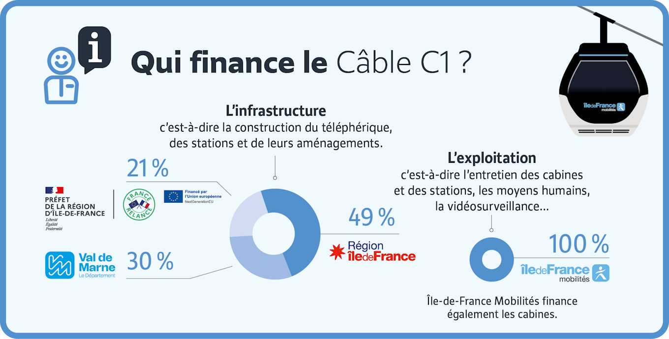 - Île-de-France Mobilités est le maître d’ouvrage du Câble C1. À ce titre, elle assure la cohérence technique et financière du projet et veille au respect du programme. En sa qualité d’Autorité Organisatrice des Transports, elle imagine, organise et finance les transports publics pour tous les Franciliens. Au cœur du réseau de transports d’Île-de-France, Île-de- France Mobilités fédère tous les acteurs (voyageurs, élus, constructeurs, transporteurs, gestionnaires d’infrastructures), décide et pilote les projets de développement et de modernisation de tous les transports, investit et innove pour améliorer le service rendu aux voyageurs. Île-de-France Mobilités finance aussi à 100 % les cabines et le fonctionnement du Câble C1.