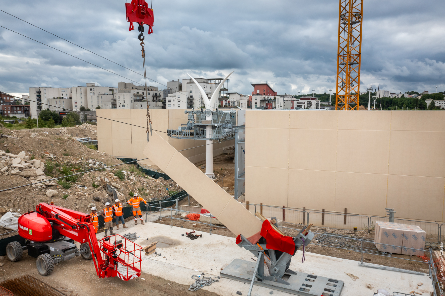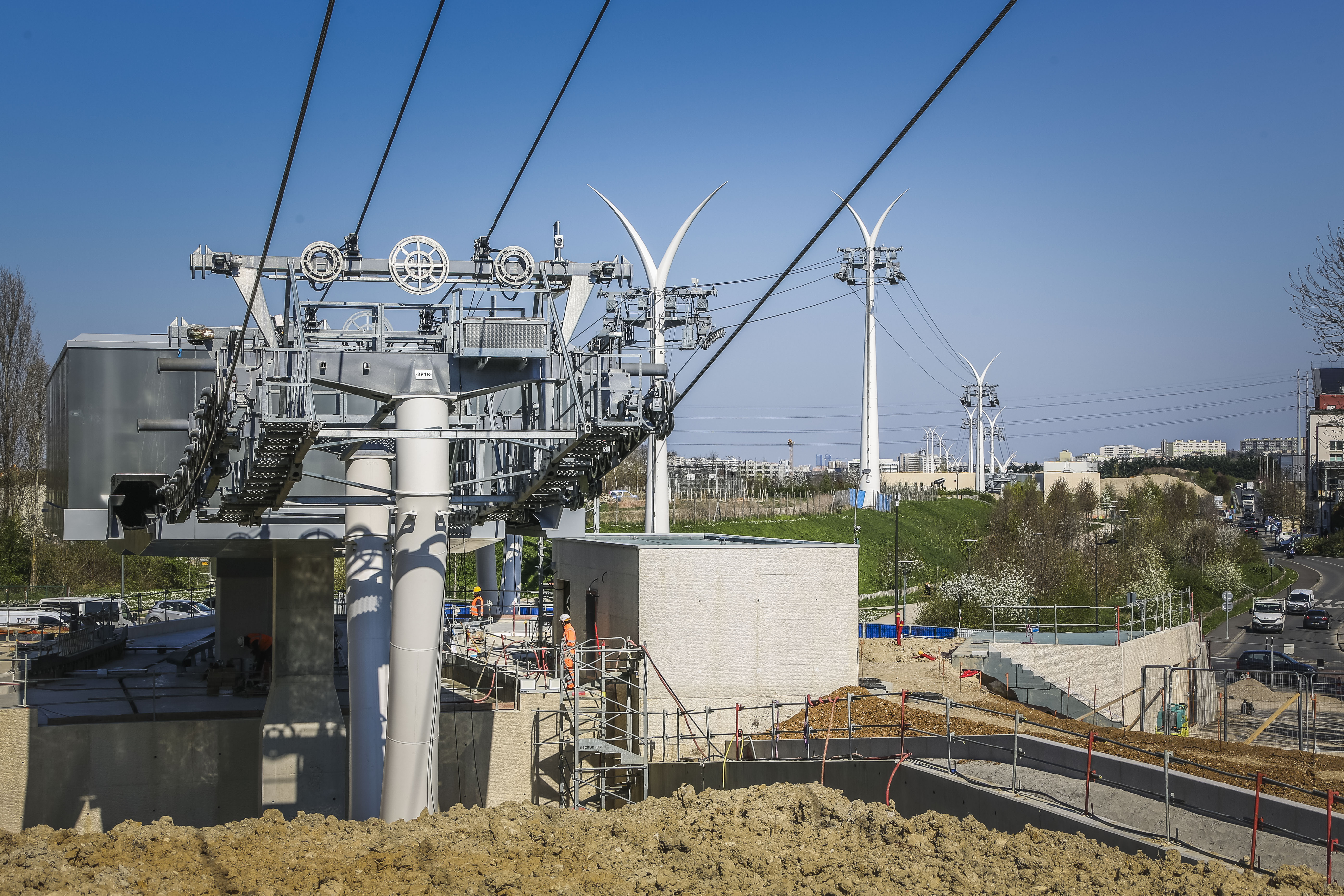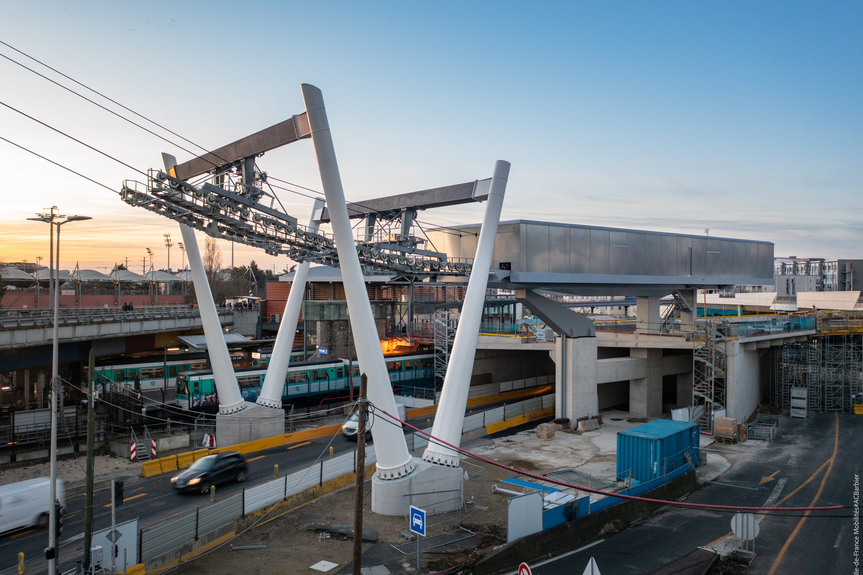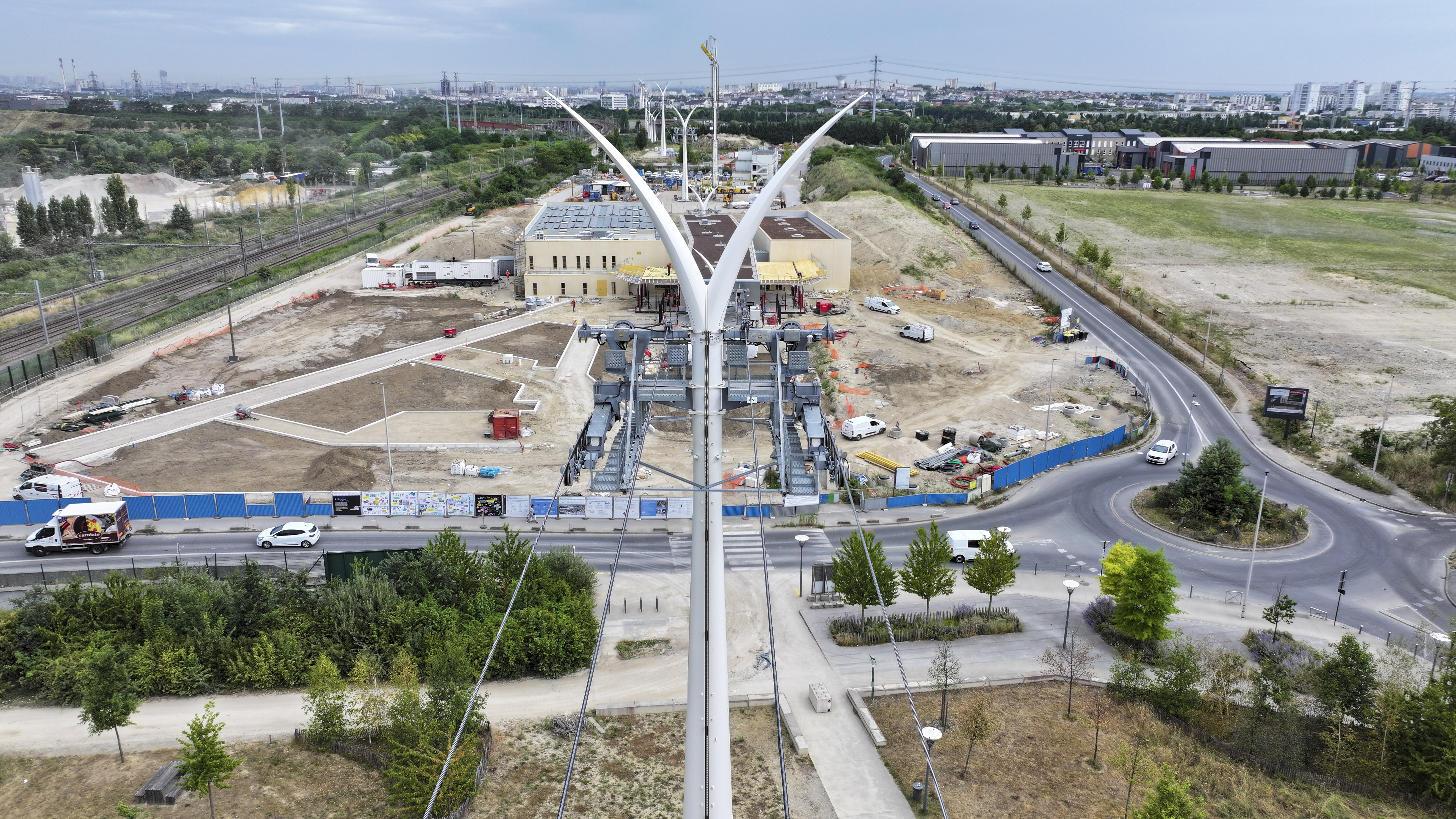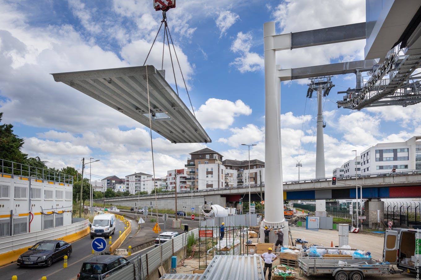 - © Île-de-France Mobilités | Levage d'un pylône, entre le parc Saint-Martin et la station La Végétale - avril 2024