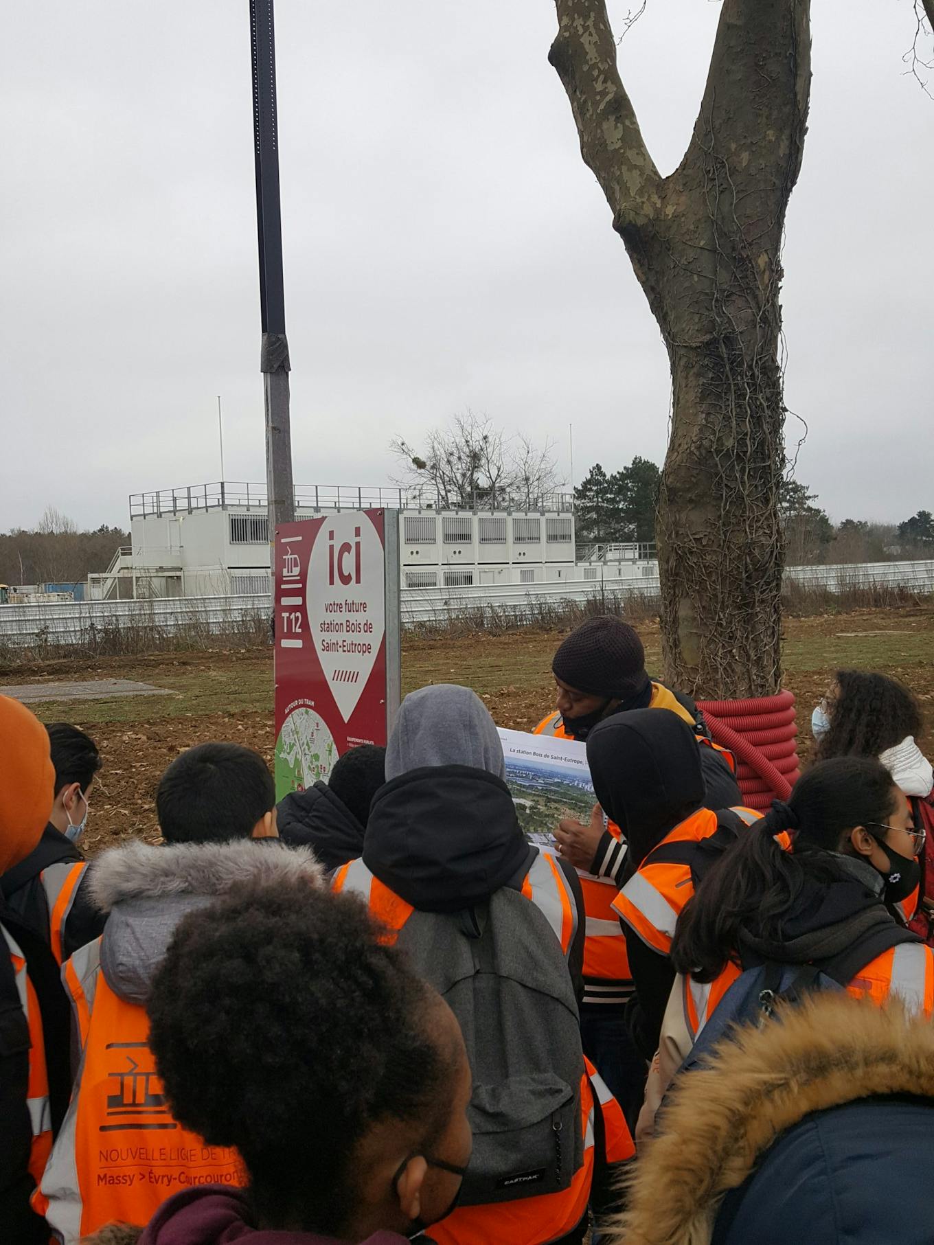 Gimmy et Patrice, les agents de proximité, ont fait visiter le chantier du tram T12 aux élèves des collèges Charles Péguy situé à Morsang-sur-Orge et Jean Lurçat situé à Ris Orangis, deux villes traversées par le tram T12.