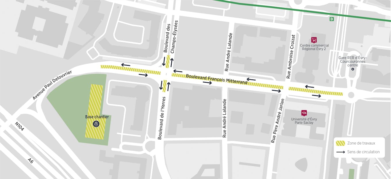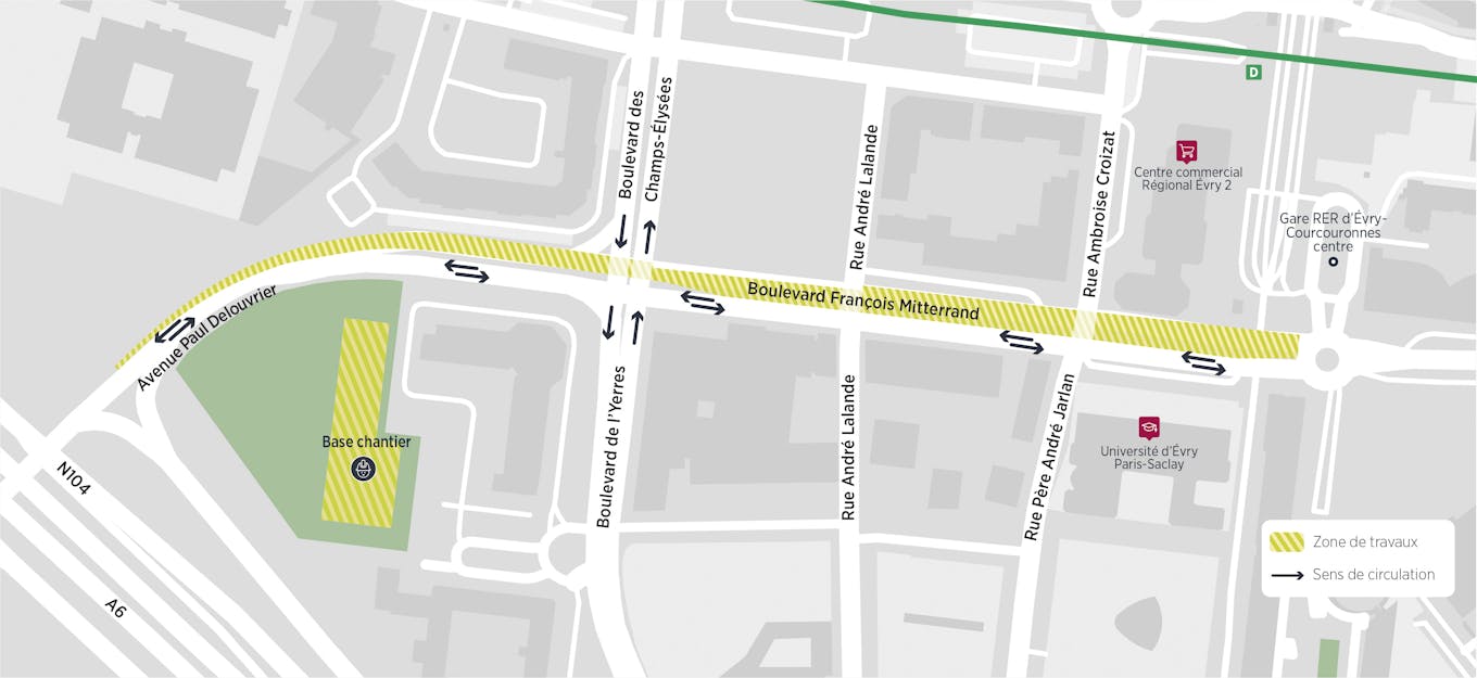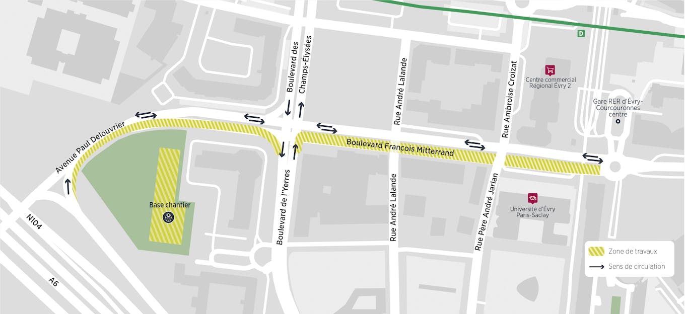en place d’une voirie, d’un éclairage et de feux provisoires) ; - phase 2 : travaux sur la voirie et les trottoirs côté sud de l’avenue Paul Delouvrier et du boulevard François
