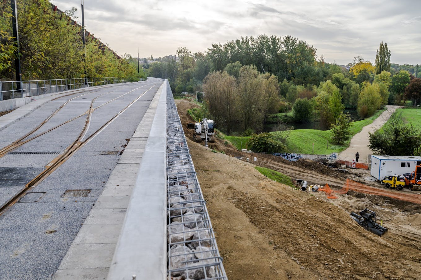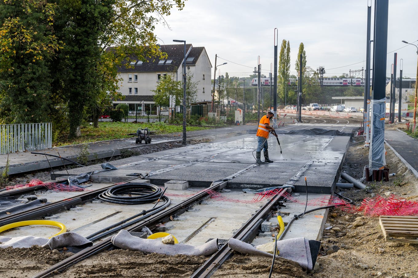 - Étape 4 : des cheminements piétons et cyclistes sont ensuite aménagés à côté de la plateforme du tram T12.