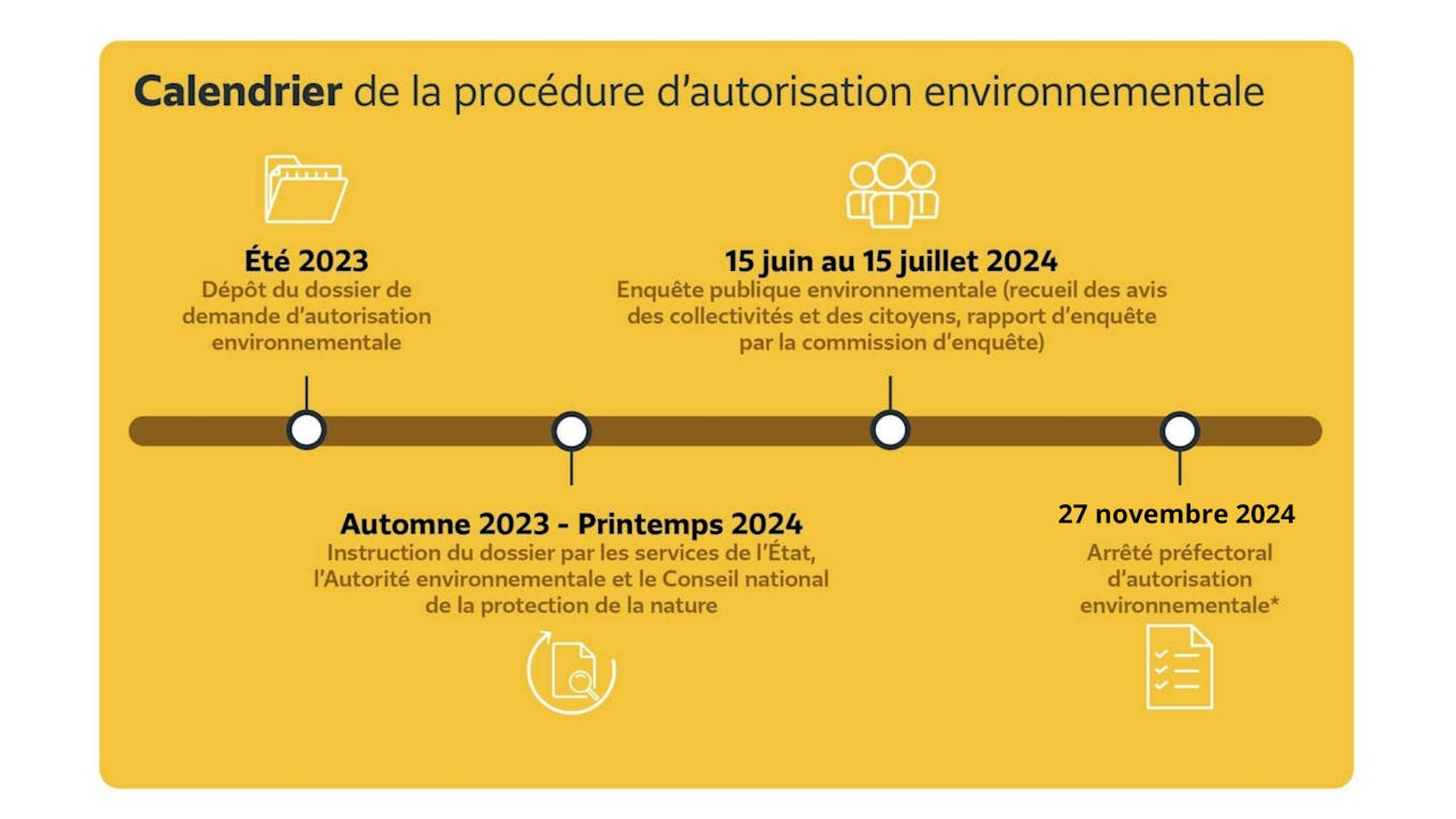 - 15 juin au 15 juillet 2024 : Enquête publique environnementale (recueil des avis des collectivités et des citoyens, rapport d'enquête par la commission d'enquête)