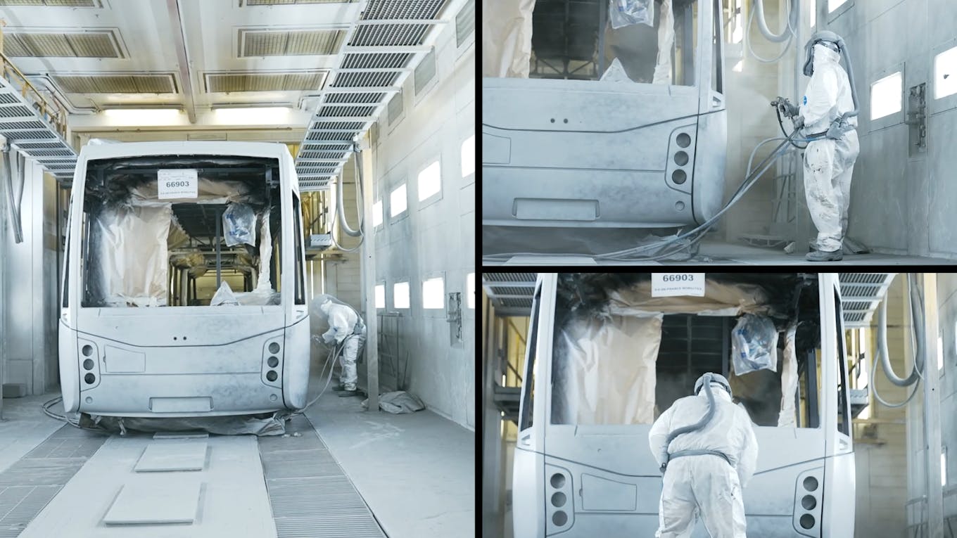 Au préalable, la carrosserie des bus est réalisée puis, au sein de l’atelier de fabrication des bus, la peinture est appliquée dans une salle dédiée par une personne utilisant un pistolet à peinture. Un travail précis qui demande rigueur et minutie.