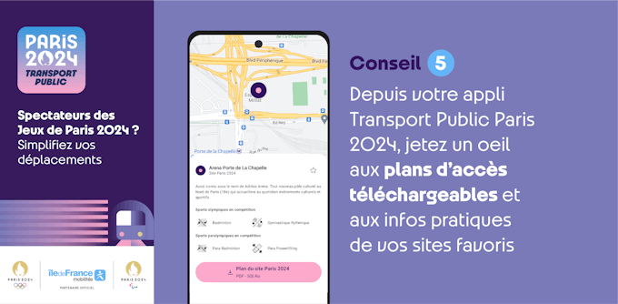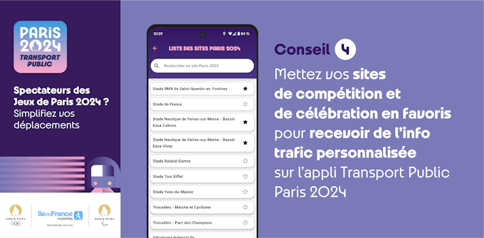 Você está planejando participar de uma competição na Arena Bercy? No Invalides ou no Golf National? Marque os locais de competição e celebração que você está indo e receba informações de trânsito personalizadas no aplicativo de transporte público de Paris 2024.