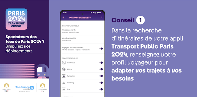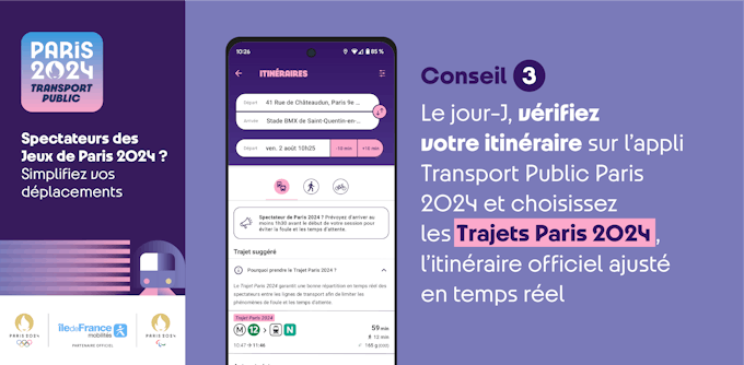 No Dia D , verifique sistematicamente sua rota no aplicativo de transporte público de Paris 2024, antes de usar o transporte público.