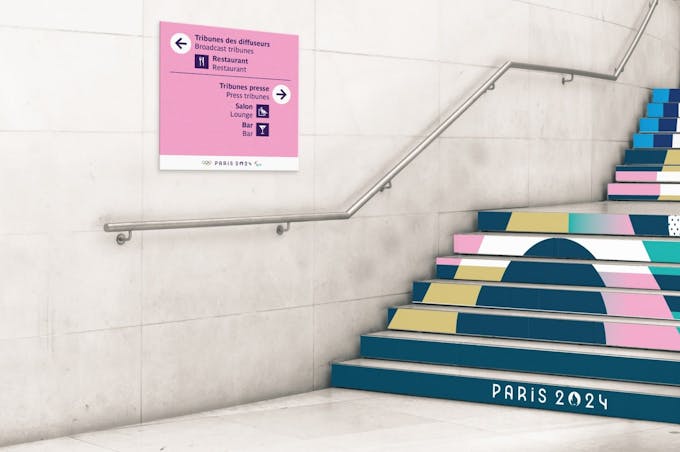 No metrô, nas estações e ônibus, nas ruas: o ambiente da Ile-de-France já é rico em sinais e códigos gráficos, alguns dos quais poderosos e muito estabelecidos. O verdadeiro desafio para a sinalização dos Jogos de Paris 2024 foi, portanto, oferecer uma identidade visual distinta e funcional que pudesse surgir em qualquer lugar, até mesmo no metrô, mas sem criar mais ruído visual.