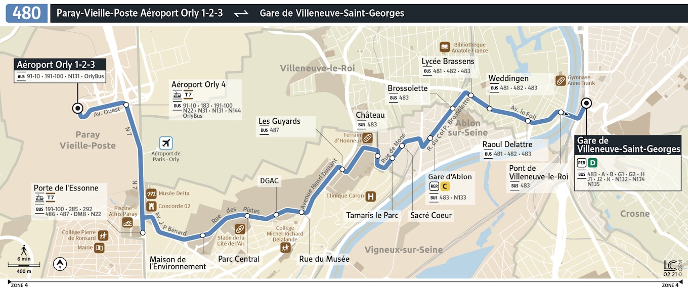 Principais paradas da linha 480: Aeroporto de Orly, Porte de l'Essonne (T7), estação Ablon (RER C), Lycée Brassens, Raoul Delattre, estação Villeneuve-Saint-Georges