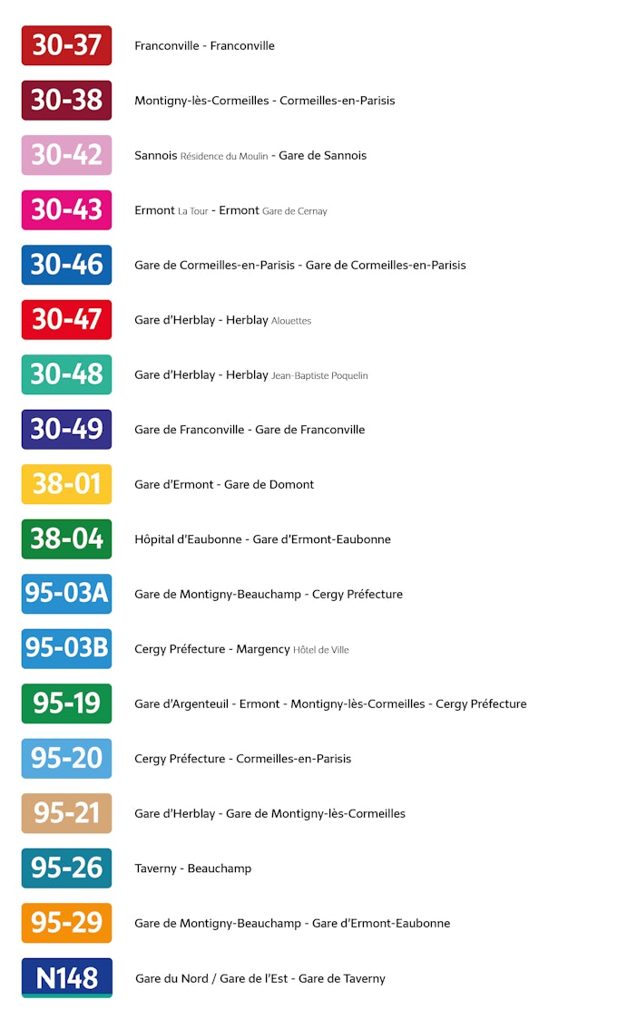 - Val Parisis para as comunas de Beauchamp, Bessancourt, Cormeilles-en-Parisis, Eaubonne, Ermont, Franconville, Frépillon, Herblay-sur-Seine, La Frette-sur-Seine, Le Plessis-Bouchard, Montigny-lès-Cormeilles, Pierrelaye, Saint-Leu-la-Forêt, Sannois, Taverny