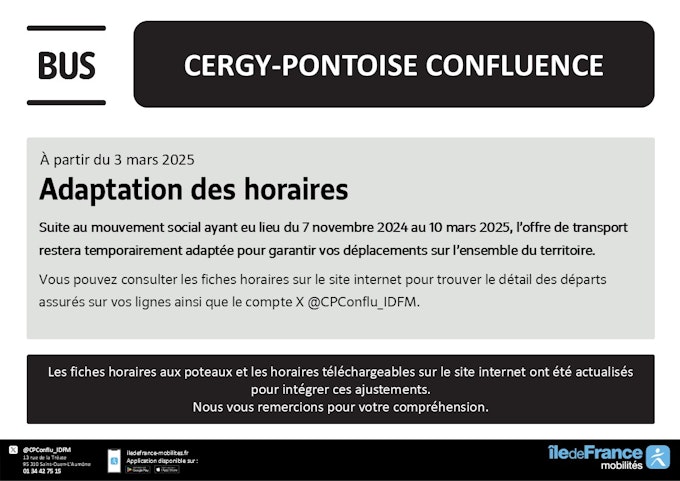 Os novos horários estão disponíveis nas paradas e na seção Horários. Para mais informações, consulte o aplicativo Île-de-France Mobilités ou @CPConflu_IDFM no X.