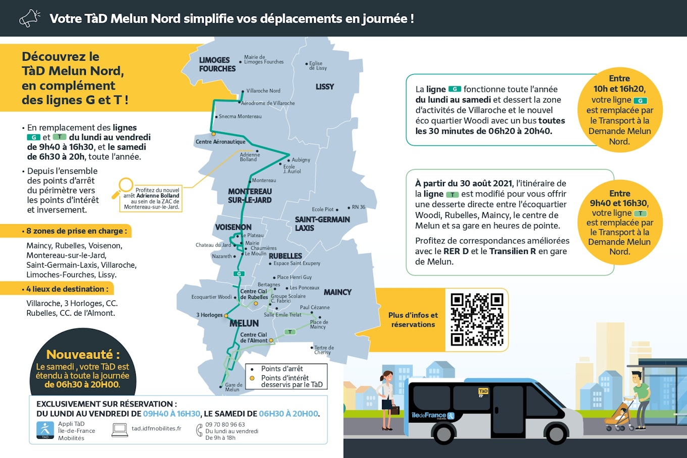 O TàD Melun Nord substitui as linhas G e T de segunda a sexta-feira das 9h40 às 16h30 e aos sábados das 6h30 às 20h, durante todo o ano.