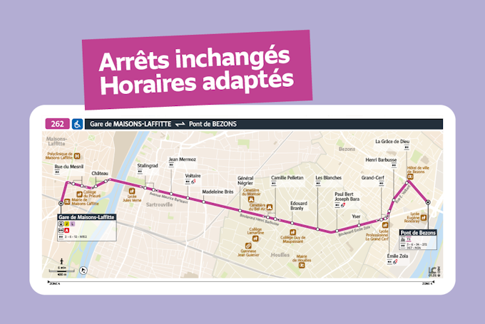 A rota e as paradas do seu ônibus na linha 262 são mantidas. Os horários e a frequência são adaptados, com uma amplitude ligeiramente estendida durante a semana e nos finais de semana.