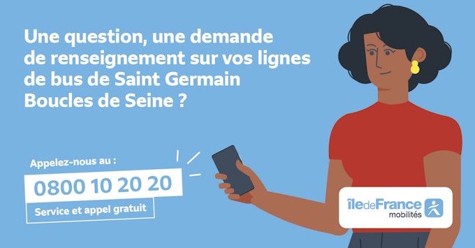 Este serviço já está implantado na área de Saint Germain Boucles de Seine. Você tem alguma pergunta ou informação sobre seus ônibus? Você pode entrar em contato conosco pelo telefone 0 800 10 20 20.