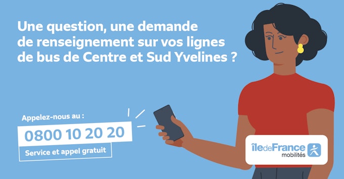 Este serviço já está implantado na área de Centre e South Yvelines. Você tem alguma pergunta ou informação sobre seus ônibus? Você pode entrar em contato conosco pelo telefone 0 800 10 20 20.
