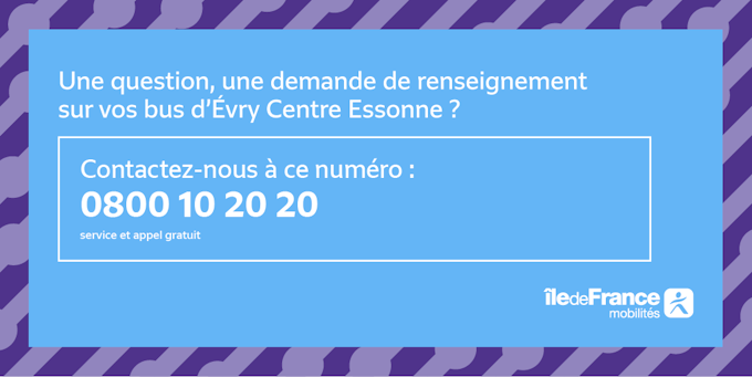 Este serviço já está implantado na área de estar de Evry Centre Essonne. Você tem alguma pergunta ou informação sobre seus ônibus? Você pode entrar em contato conosco pelo telefone 0 800 10 20 20.