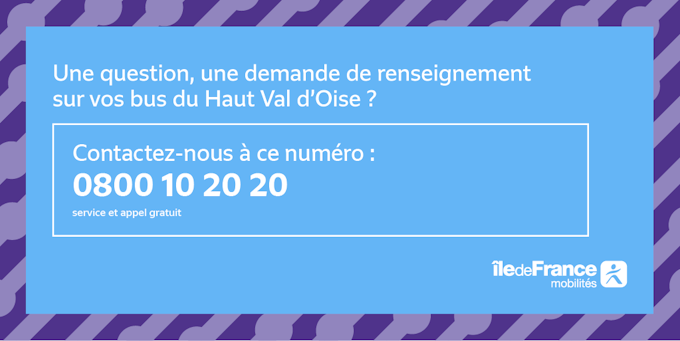 Este serviço já está implantado na área de convivência de Haut Val d'Oise. Você tem alguma pergunta ou informação sobre seus ônibus? Você pode entrar em contato conosco pelo telefone 0 800 10 20 20.