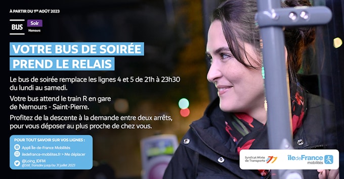 Encontre todas as novidades, rotas e horários do seu novo Ônibus Noturno no site da iledefrance-mobilites.fr e na conta do Twitter @Loing_IDFM (@Still_Transdev até 31 de julho de 2023).