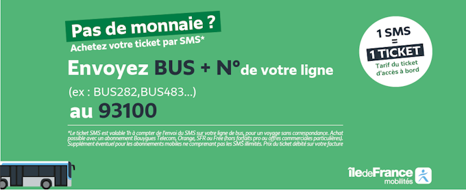 Para comprar o seu bilhete por SMS, válido nas suas linhas 282, 480, 482, 483 e Licorne, envie BUS e o número da linha para 93100
