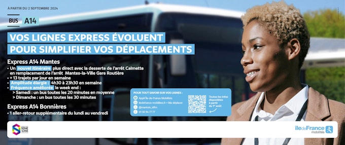 Para economizar seu tempo em viagem, a estação Mantes-la-Ville Gare Routière será transferida para a estação Mantes-la-Jolie Quai 10. Se você chegar perto da estação Mantes-la-Ville, terá apenas que pegar a passarela que liga as duas estações. Estacionamento para carros, scooters e bicicletas está disponível para estacionamento. E, claro, muitas conexões com suas linhas de ônibus são possíveis para uma viagem sem estresse.