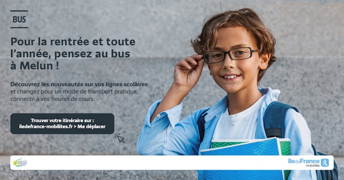 Foto de um menino, estudante do ensino médio, cadernos na mão e bolsa nas costas, sorrindo com o slogan da campanha e encaminhamento para o site da Île-de-France Mobilités para mais informações